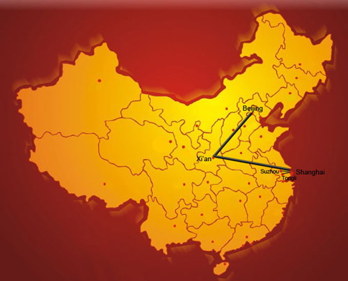 Suzhou 1 noche y Shanghai 2 noches. Visitando: Beijing 3 noches, Xian 2 noches, Chengdu 2 noches, Hangzhou 2 noches,